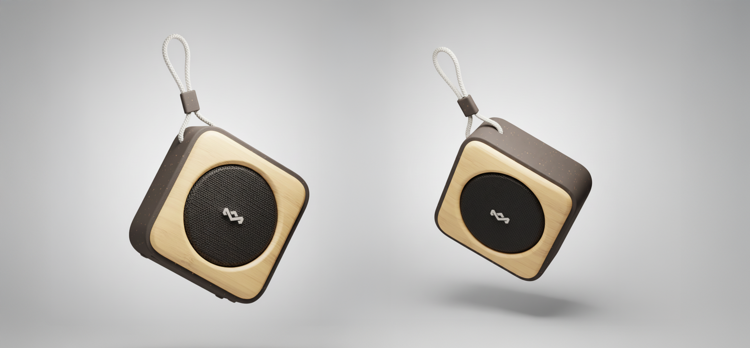 The House of Marley speaker's compact square design perfectly balances portability with premium materials, featuring a distinctive two-tone bamboo and dark accent finish. The integrated rope lanyard adds both functionality and brand personality, while the prominent driver grille and rounded corners create a form that's both acoustically optimized and pocket-friendly. This design proves that sustainable materials can deliver both visual impact and practical portability without compromise.