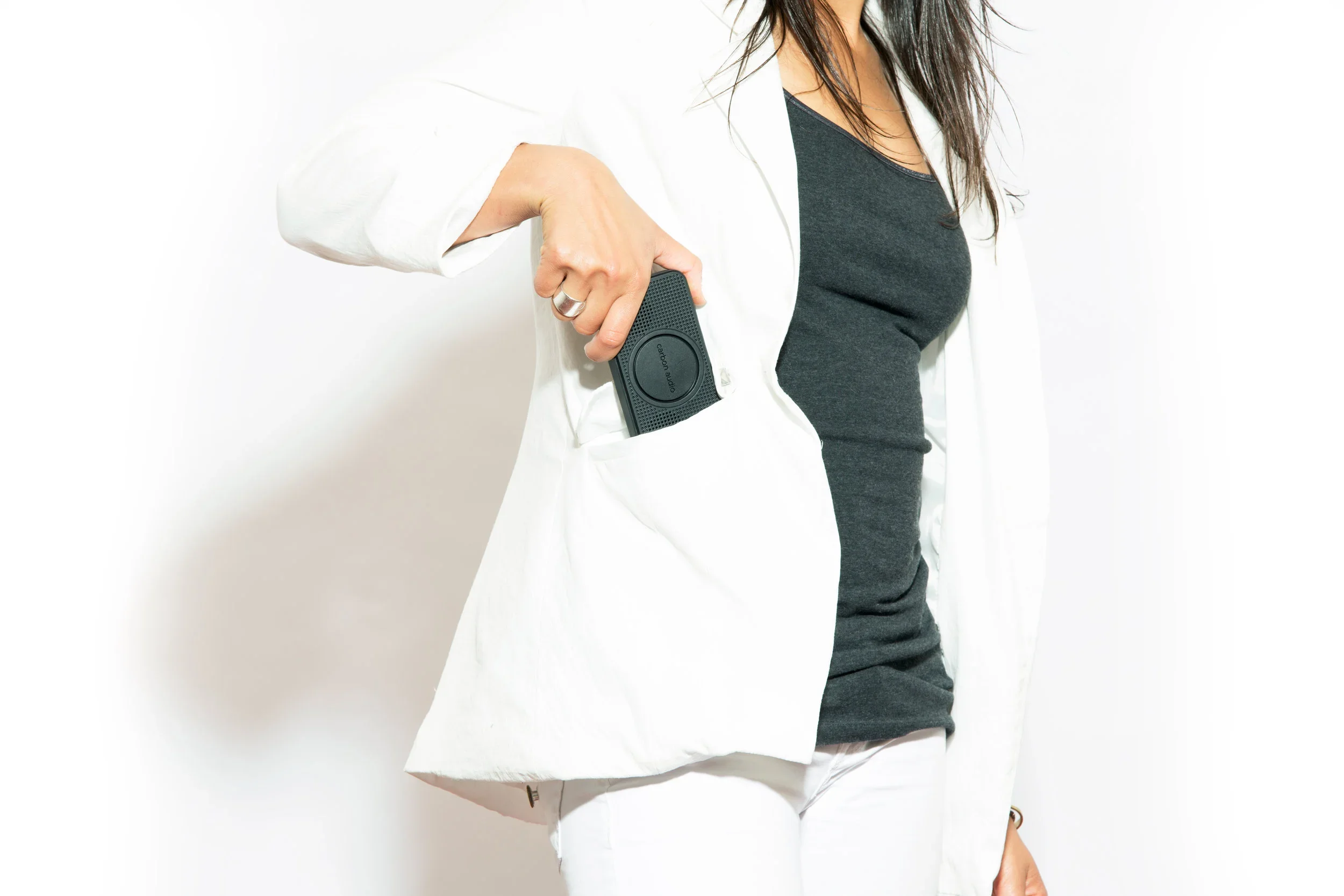 The Carbon Audio Pocket Speaker design prioritizes maximum acoustic performance within an ultra-compact form factor, featuring a perforated grille that serves both functional and aesthetic purposes—allowing sound projection while creating a distinctive visual texture. Every design element reinforces the core value proposition: this tiny device punches well above its weight class, proving that exceptional audio doesn't require sacrificing true portability.