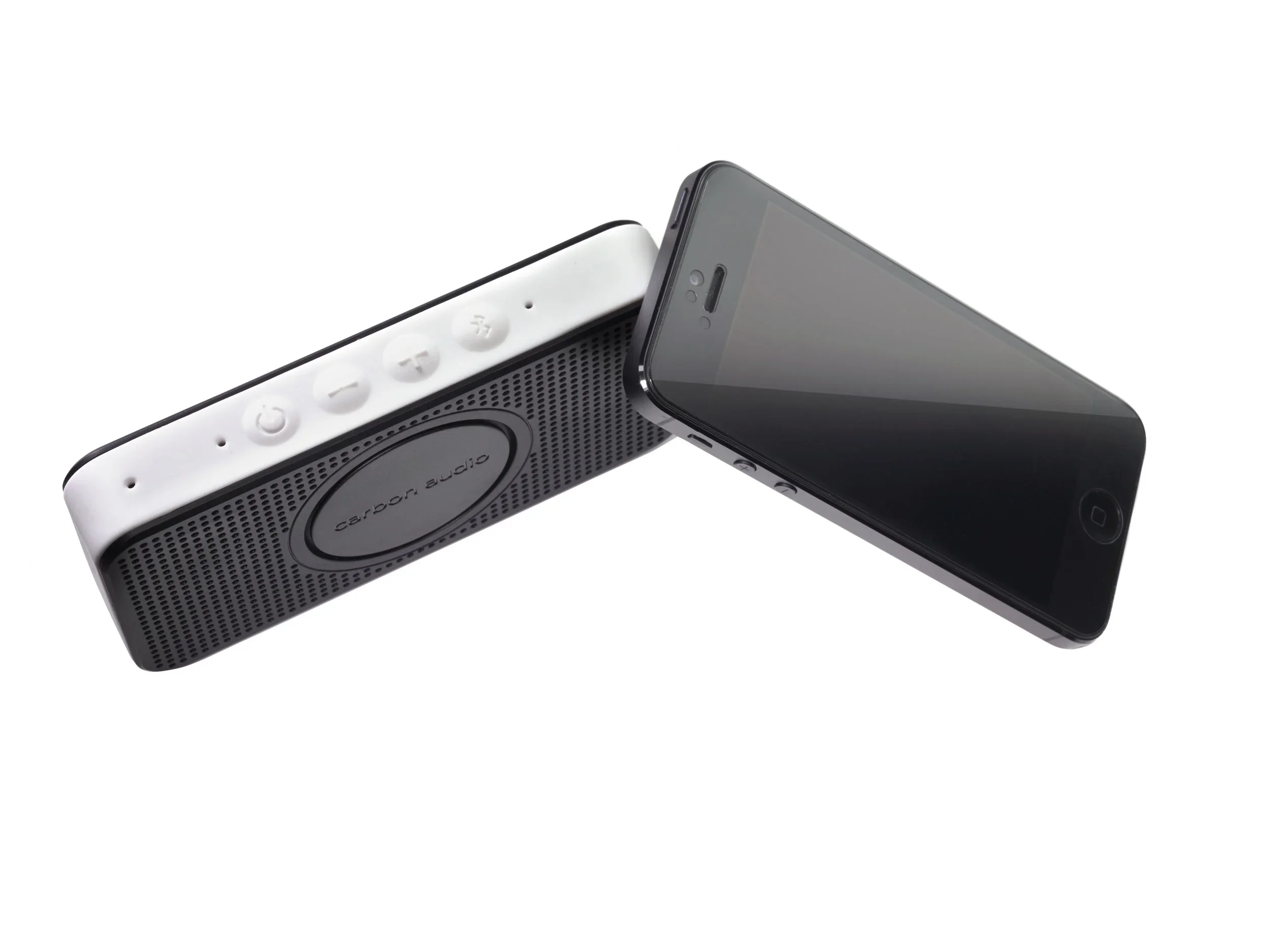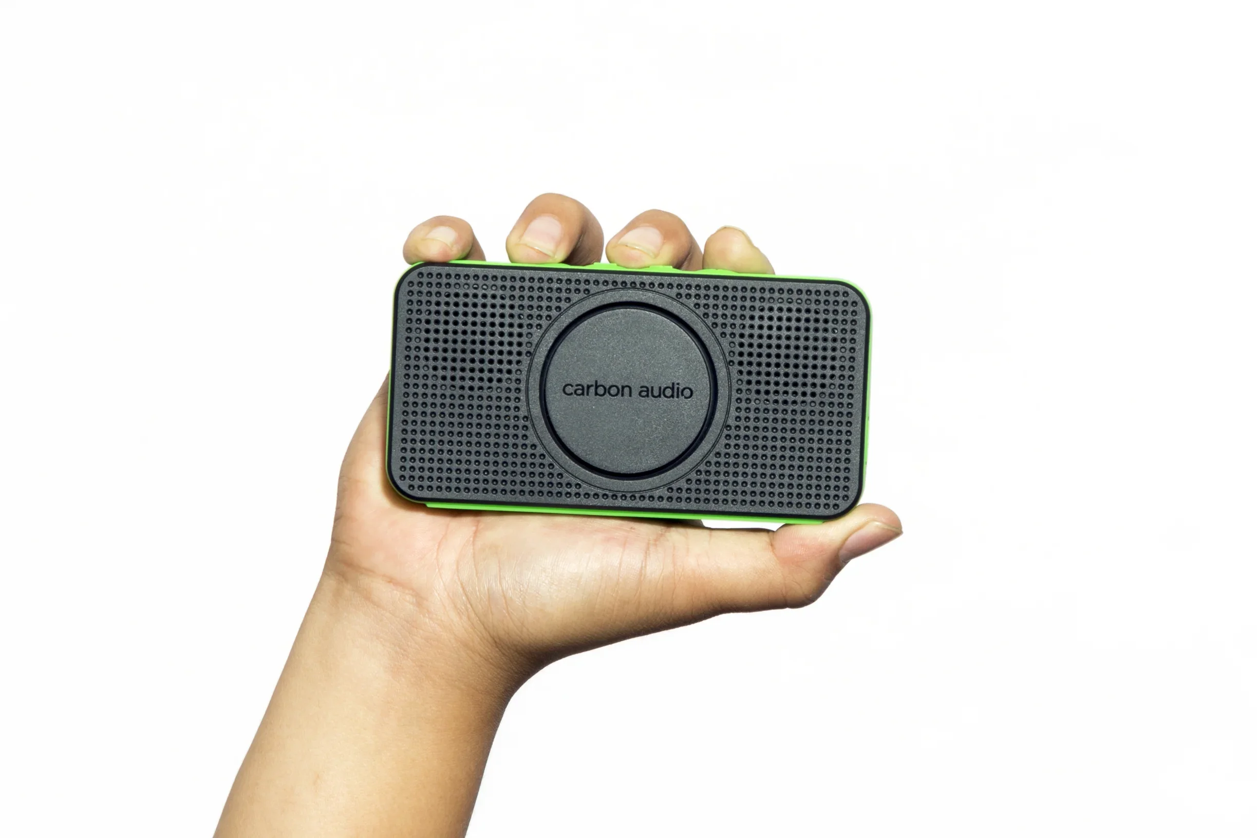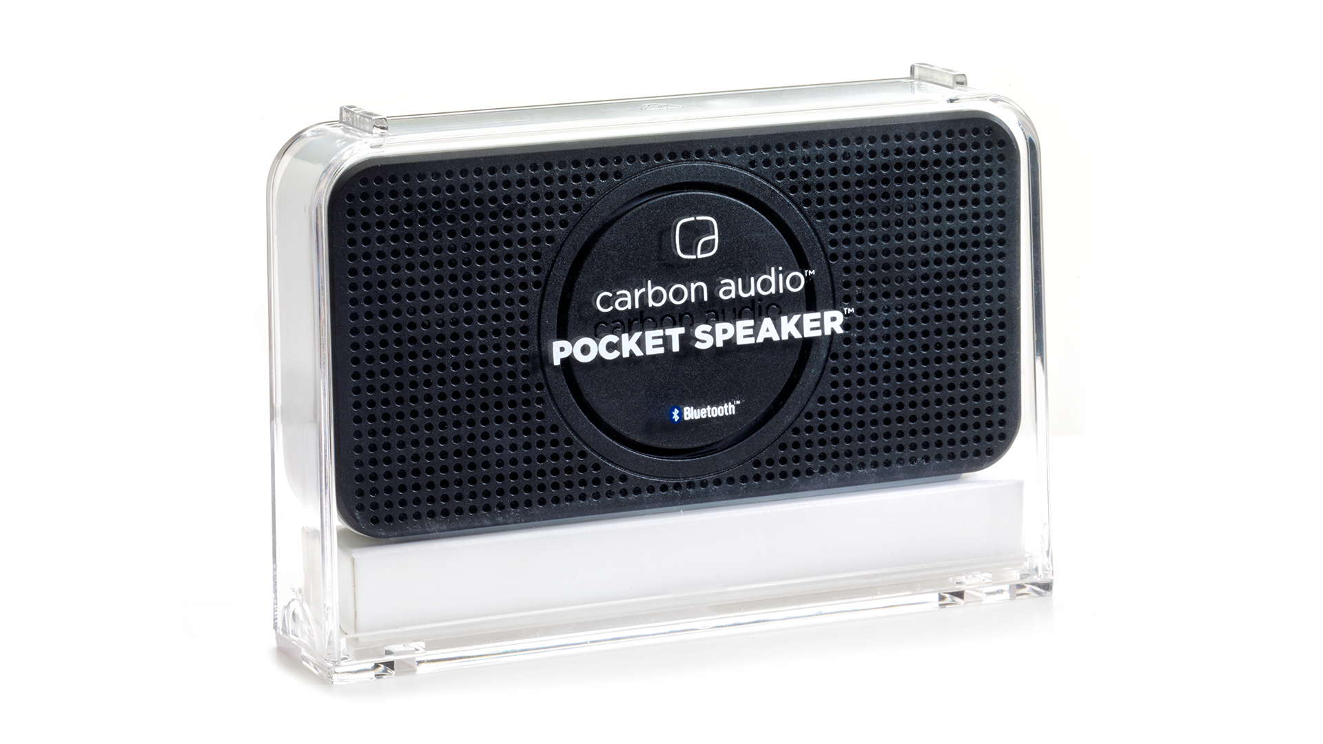 The Carbon Audio Pocket Speaker packaging demonstrates a "product as hero" approach, encasing the speaker in a clear, protective case that doubles as both packaging and carrying solution. This transparent design immediately communicates the product's compact size while allowing customers to see exactly what they're purchasing—no hidden bulk or misleading marketing imagery. The crystal-clear case reinforces the value proposition of true portability, as customers can instantly grasp that this device genuinely fits in your pocket while the bold branding on the speaker itself promises room-filling sound.